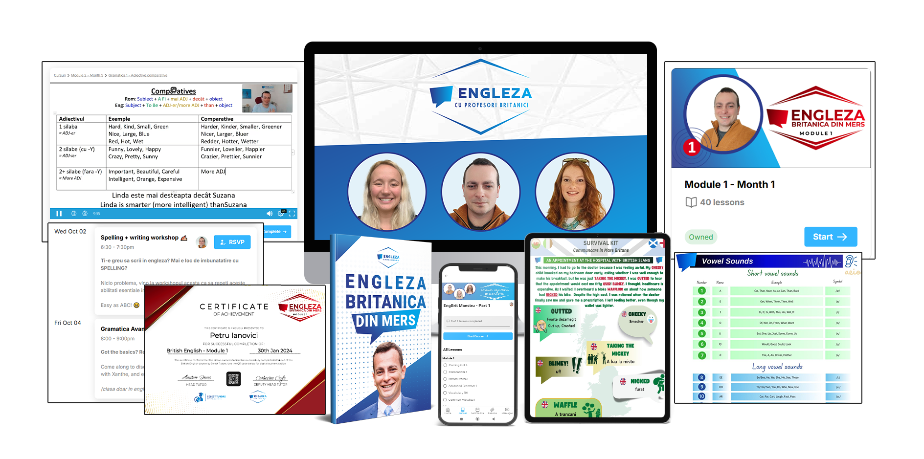 Explicatii in ROMANA + accent BRITANIC – intelegi tot si vorbesti corect.